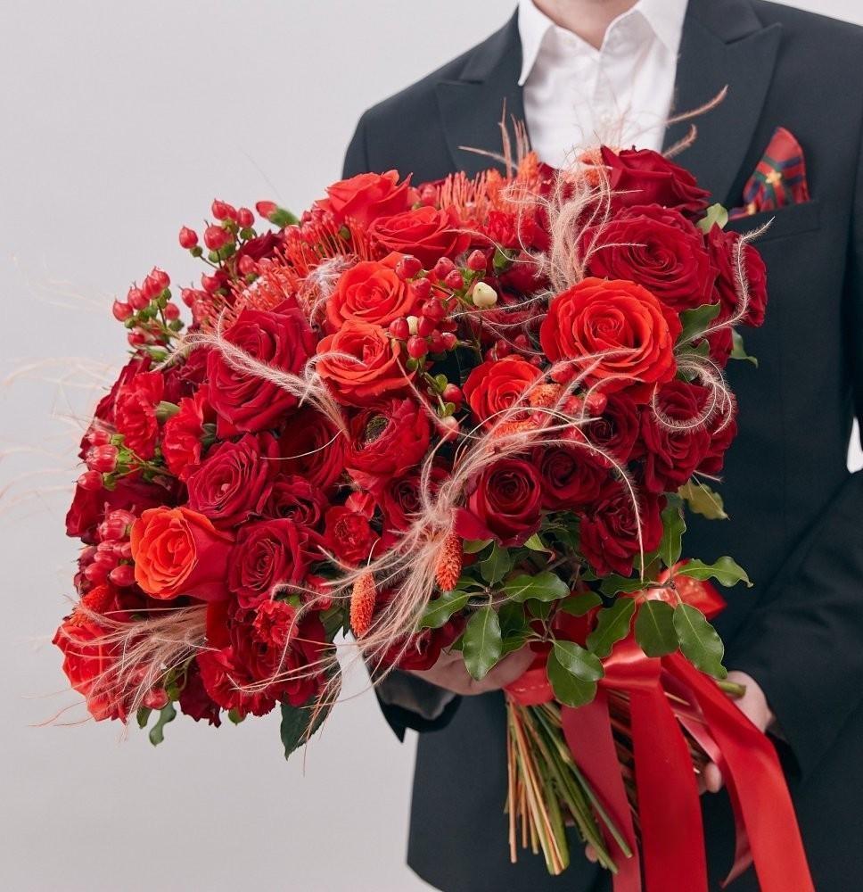 Punaiset ruusut... tie jokaisen naisen sydämeen! Punainen väri symboloi rakkautta, kauneutta, kunnioitusta ja romantiikkaa. Lisäromanttisen kosketuksen saavuttamiseksi voit kirjoittaa viestin tai runon kimpun mukana. Punaisen ruusujen määrällä kukkakimpussa tai asetelmassa on myös tärkeä rooli niiden merkityksen määrittämisessä.